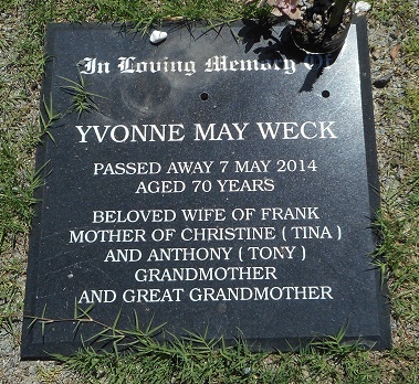 In loving Memory of Yvonne May Weck Passed away 7 May 2014 aged 70 years. Beloved wife of Frank, Mother of Christine (Tina) and Anthony (Tony) Grandmother and Great Grandmother. |